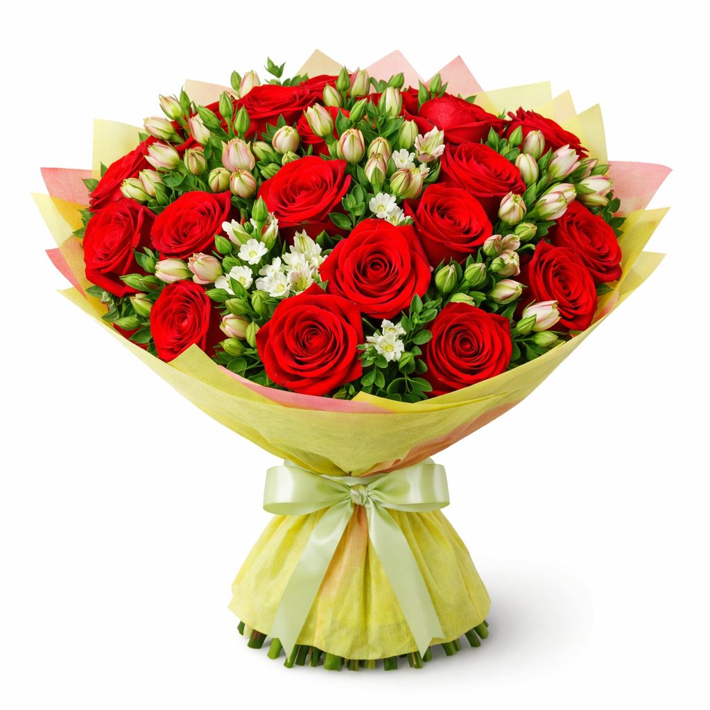 | Состав: | Розы, Альстромерии, Гвоздики, Кустовые розы |