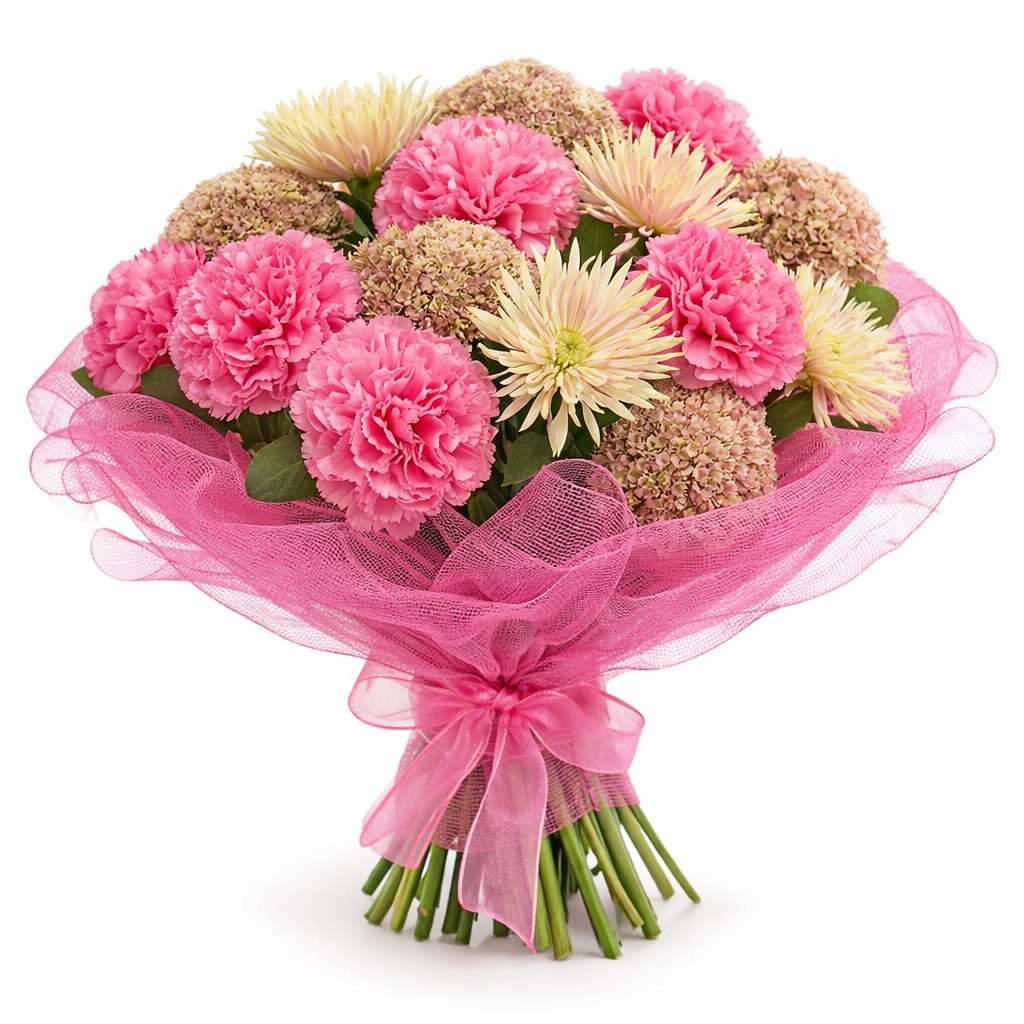 Нежные розовые и кремовые гортензии в сочетании с хризантемой улыбка и озотамнусом создают изысканную композицию. Букет перевязан розовой декоративной сеткой, придающей ему лёгкость и воздушность. Возможна альтернатива с атласной лентой или матовой плёнкой. Прекрасный выбор для подарка на день рождения для любимой.