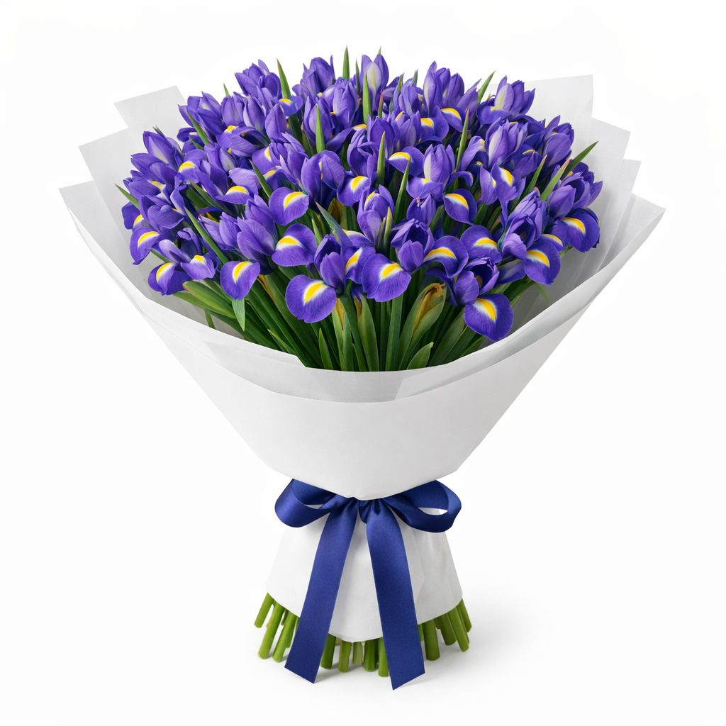 Яркие ирисы в этом букете создают атмосферу весеннего настроения и свежести. Упакован в белую матовую плёнку и перевязан атласной лентой насыщенного синего цвета. Возможны альтернативы упаковки: крафт-бумага или декоративная сетка. Прекрасный выбор для подарка на 8 марта или для любимой.