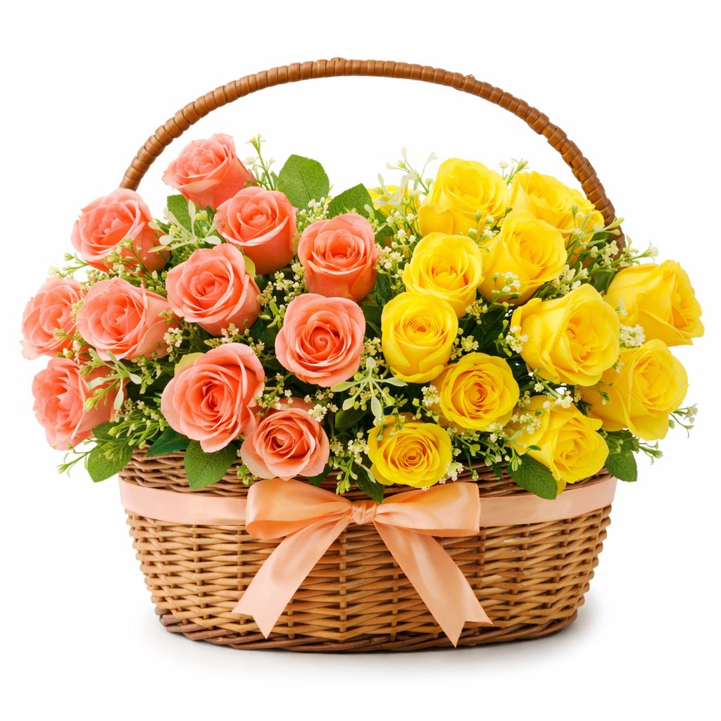 Эта цветочная композиция сочетает в себе розовые и желтые одноголовые розы, дополненные свежей зеленью. Корзина выполнена из натурального материала, что придаёт ей естественный и изысканный вид. Для альтернативного оформления можно выбрать плетёную корзину или корзину из лозы. Подходит для поздравления на день рождения или для любимой.