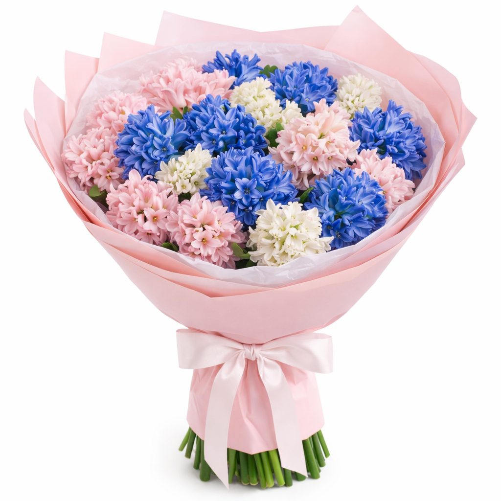 Гиацинты и статица создают нежное сочетание розовых и синих оттенков. Букет оформлен в матовую плёнку розового цвета и перевязан белой атласной лентой. Возможны альтернативы с крафт-бумагой или декоративной сеткой. Прекрасный подарок для любимой на день рождения.