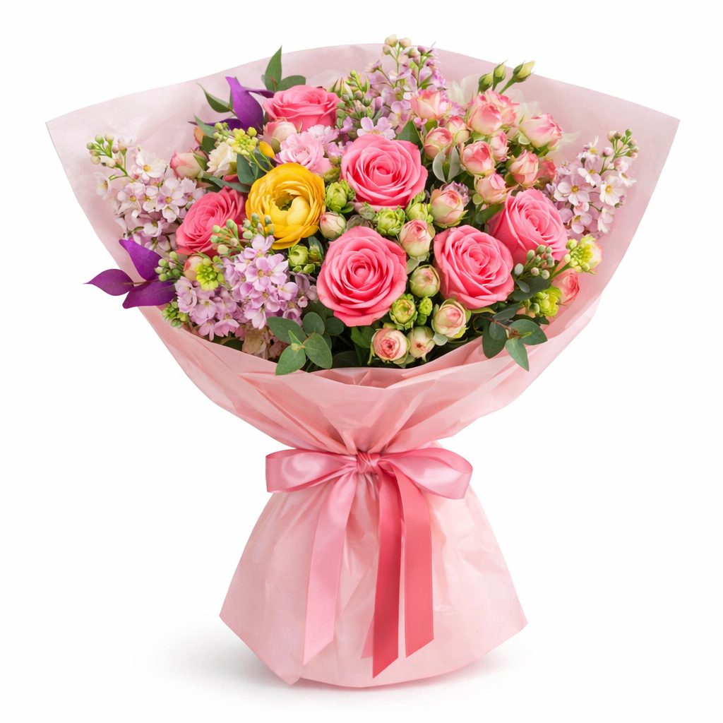 Роскошное сочетание розовых одноголовых и кустовых роз, дополняемое нежной розовой маттиолой и яркой желтой орхидеей, создаёт атмосферу утончённой элегантности. Эвкалипт и гипсофила добавляют свежести и воздушности. Букет оформлен в матовую пленку и перевязан розовой лентой. Возможны варианты упаковки с использованием крафт-бумаги или декоративной сетки. Прекрасный подарок для любимой на годовщину или день рождения.