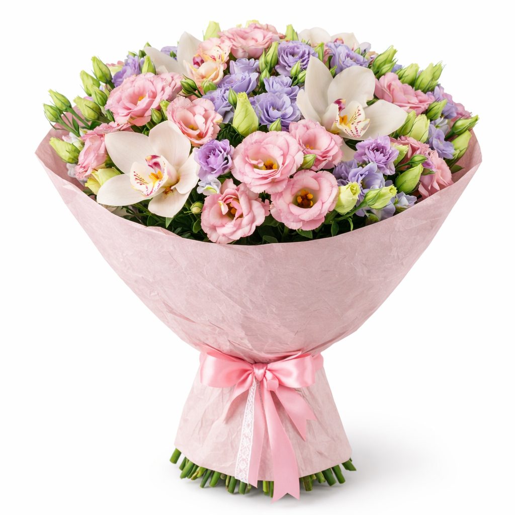 Белоснежные орхидеи, розовые эустомы и сиреневые маттиолы создают нежное сочетание в этом букете. Упакован в розовую крафт-бумагу и перевязан атласной лентой. Возможна упаковка в матовую плёнку или декоративную сетку. Прекрасный подарок для любимой на годовщину или день рождения.