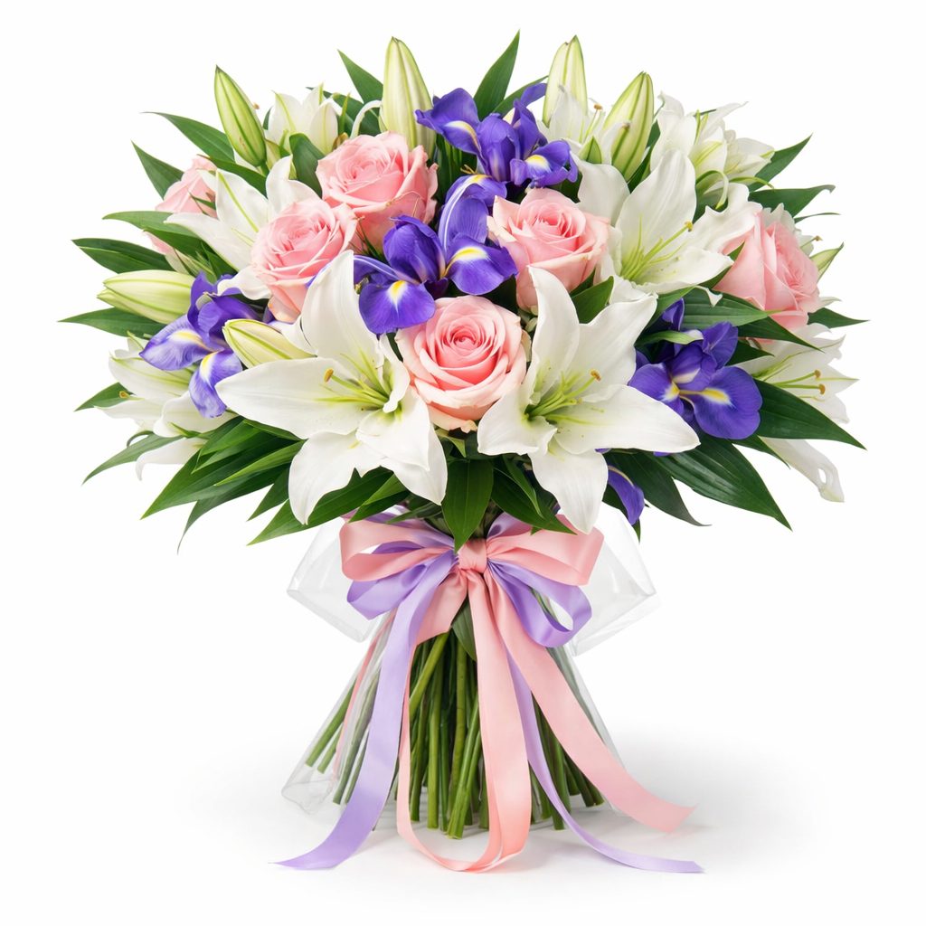 Белоснежные лилии, розовые розы и яркие ирисы создают гармоничную композицию, полную изящества и утончённости. Букет перевязан лентами в нежных пастельных тонах, что подчёркивает его элегантность. Возможны варианты упаковки с использованием матовой плёнки или декоративной сетки. Прекрасный выбор для подарка на день рождения для любимой или мамы.
