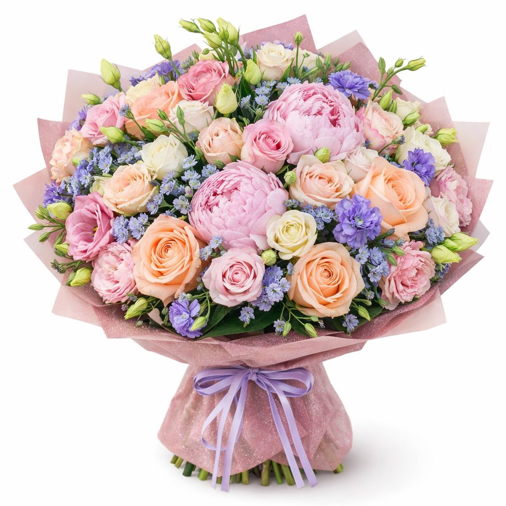 Роскошный букет сочетает в себе розовые пионы, кремовые одноголовые и кустовые розы, белую и розовую эустому, розовую гвоздику, фиолетовую маттиолу и зелень фисташки. Упакован в матовую пленку с нежной лентой. Возможны альтернативы: крафт-бумага или декоративная сетка. Прекрасный выбор для подарка на день рождения для любимой.