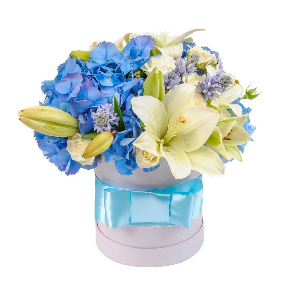 Голубая гортензия гармонично сочетается с белыми лилиями и кустовыми розами, создавая атмосферу свежести и утончённости. Композиция дополнена изящными гиацинтами, которые придают ей особую изысканность. Упаковано в элегантную шляпную коробку белого цвета, перевязанную голубой атласной лентой. Возможны варианты оформления в бархатной или дизайнерской коробке. Прекрасный подарок для любимой на годовщину или для мамы на День матери.